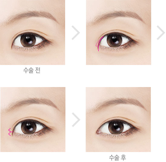 | 몽고주름을 위로 W자 모양으로 최소절개한 후, 몽고주름의 피부를 바깥쪽으로 옮겨주고 남는 피부는 잘라내어 눈앞의 공간을 터주게 됩니다. | ||||||||||||||||||||