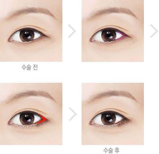 | 눈꼬리 쪽을 절개 후 피부와 결막을 박리하여 눈의 좌우 폭을 넓혀주어 시원한 눈매를 만들 수 있습니다. | ||||||||||||||||||||